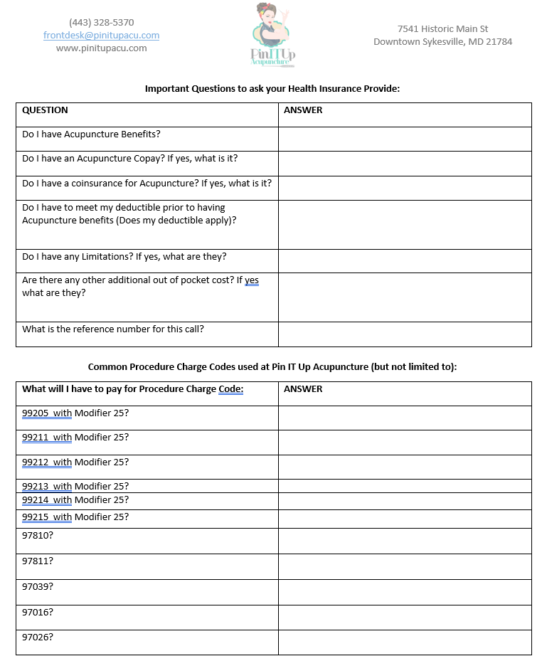 If you want to know about any additional charges for the Procedure Codes most commonly used at Pin IT Up Acupuncture, then ask your Health Insurance representative “Are there any cost to me for any of the following Procedure Codes”? (These are the most common procedure codes used at Pin IT Up Acupuncture, but not limited to.)